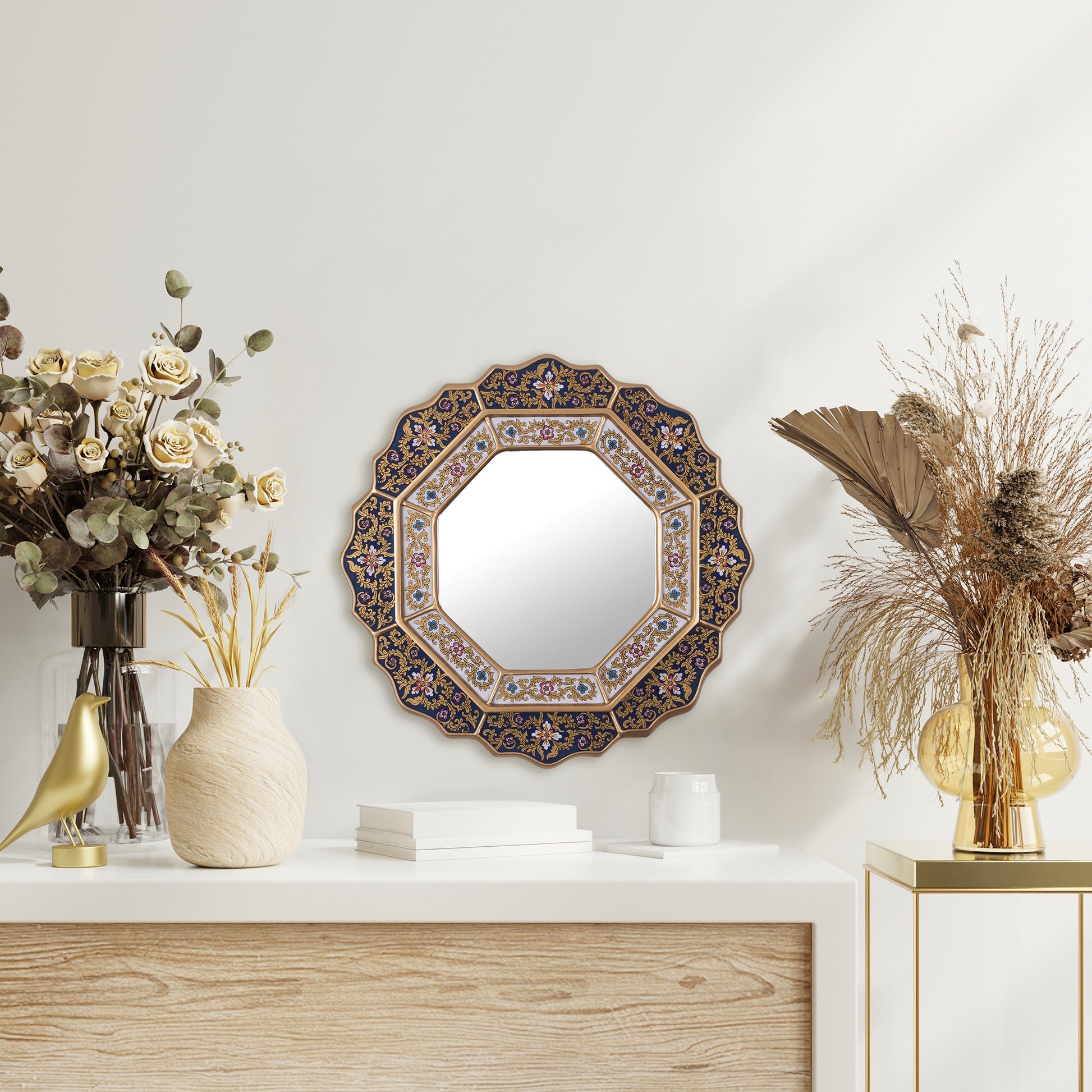 Carrying the Cajamarca artistic tradition close to her heart, Asunta Pelaez handcrafts this breathtaking mirror. Its graceful contours, supported by a wooden frame, are carefully inlaid with pieces of glass embellished by a delicately hand-painted flower motif against a dark blue background.